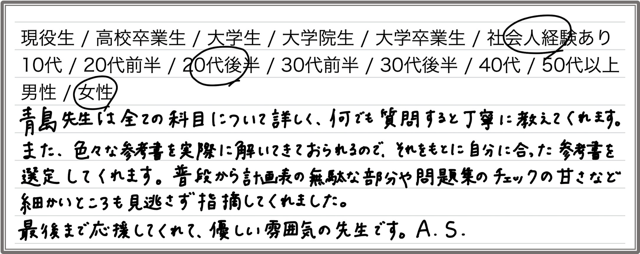 青島先生は全ての科目について詳しく、何でも質問すると丁寧に教えてくれます。また、色々な参考書を実際に解いてきておられるので、それをもとに自分に合った参考書を選定してくれます。普段から計画表の無駄な部分や問題集のチェックの甘さなど細かいところも見逃さず指摘してくれました。最後まで応援してくれて、優しい雰囲気の先生です。(A.S.さん)