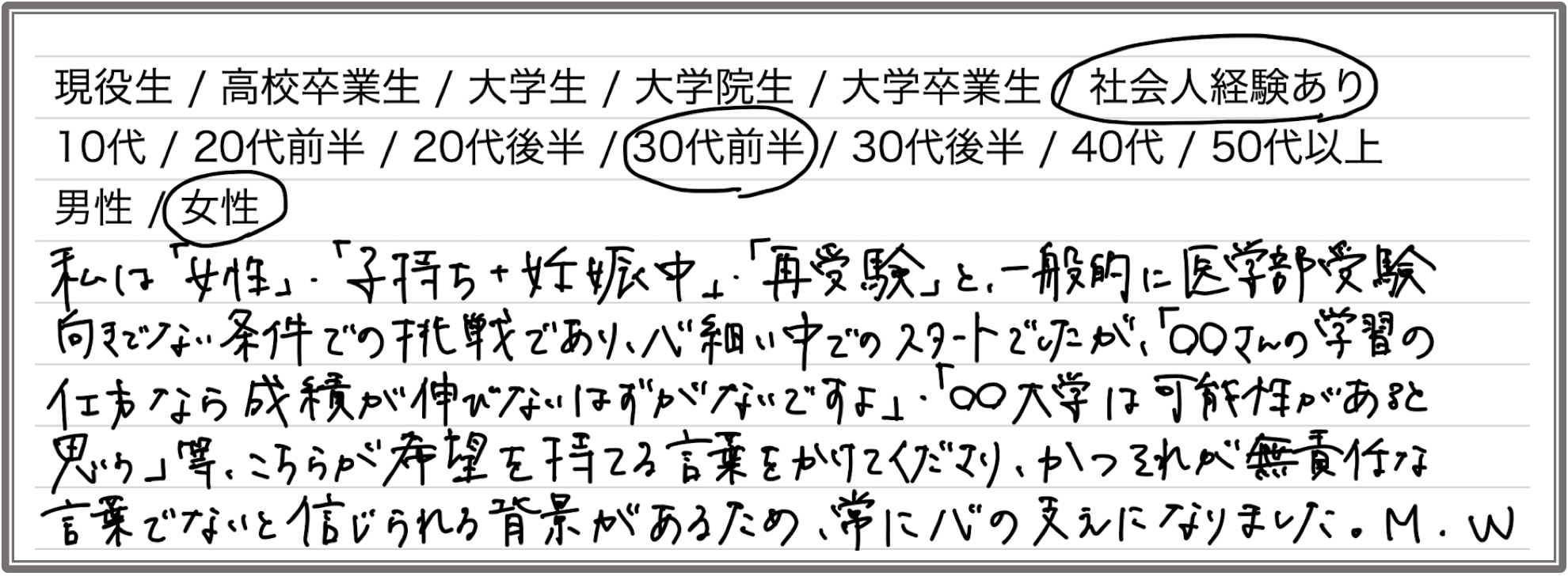 私は女性・子持ち+妊娠中・再受験と、一般的に医学部受験向きでなさそうな条件での挑戦であり、心細い中でのスタートでしたが、「〇〇さんの学習の仕方なら成績が伸びないはずがないですよ」「〇〇大学は可能性があると思う」などこちらが希望を持てる言葉をかけてくださり、かつそれが無責任な言葉でないと信じられる背景があるため常に心の支えになりました。(M.W.さん)