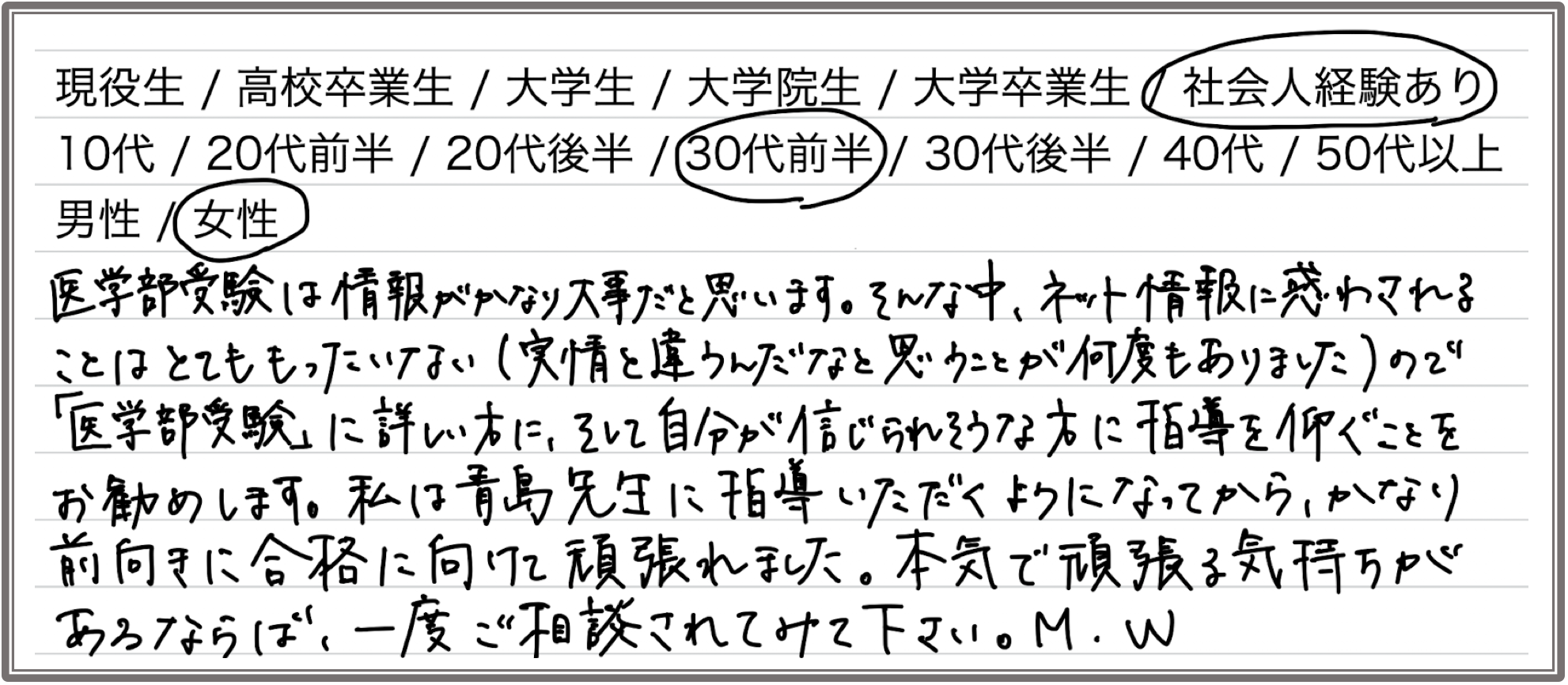 医学部受験は情報がかなり大事だと思います。そんな中、ネットの情報に惑わされることは無駄な部分が極めて多い(実情と違うんだなと感じることが何度もありました)ので、「医学部受験」に詳しい方に、そして自分が信じられそうな方に指導を仰ぐことをお勧めします。私は青島先生に指導いただくようになってから、かなり前向きに合格に向けて頑張れました。本気で頑張る気持ちがあるならば、一度ご相談されてみてください。(M.W.さん)