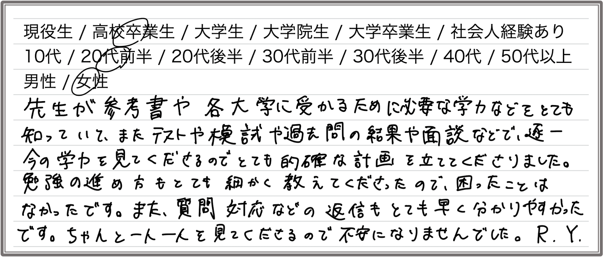 先生が参考書や各大学に受かるために必要な学力などをとても知っていて、またテストや模試や過去問の結果や面談などで、逐一今の学力を細かく見てくださるのでとても的確な計画を立ててくださりました。勉強の進め方もとても細かく教えてくださったので、困ったことはなかったです。また、質問対応などの返信もとても早く分かりやすかったです。ちゃんと一人一人を見てくださるので不安になりませんでした。(R.Y.さん)