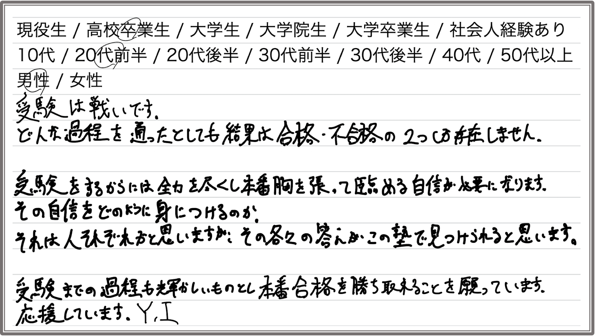 受験は戦いです。どんな過程を通ったとしても結果は合格不合格の2つしか存在しません。受験をするからには全力を尽くし本番胸を張って臨める自信が必要になります。その自信をどのように身につけるのか。それは人それぞれかと思いますが、その各々の答えがこの塾で見つけられると思います。受験までの過程も輝かしいものとし本番合格を勝ち取れることを願っています。応援しています。(Y.I.さん)