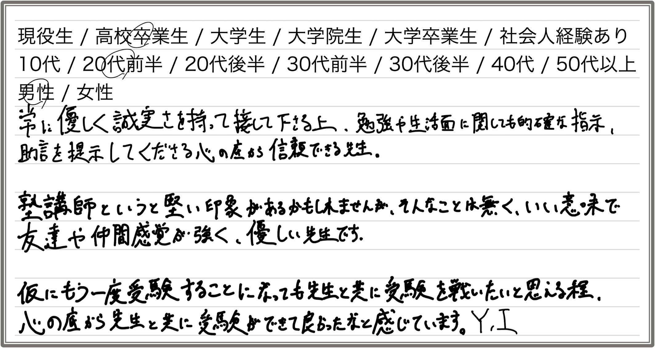 常に優しく誠実さを持って接して下さる上、勉強や生活面に関しても的確な指示、助言を提示してくださる心の底から信頼できる先生。塾講師というと堅い印象があるかもしれませんが、そんなことは無く、いい意味で友達や仲間感覚が強く、優しい先生です。仮にもう一度受験することになっても先生と共に受験を戦いたいと思える程、心の底から先生と共に受験ができて良かったなと感じています。(Y.I.さん)