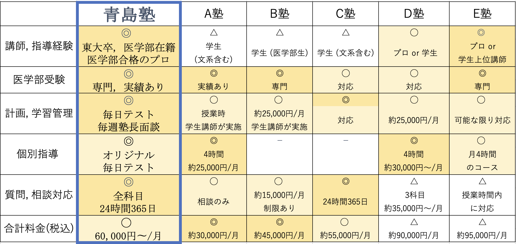 青島塾は「本気で医者になりたい」という覚悟のある方ならば、どなたでも入塾金は無料、基本のコーチングと毎日テスト+学習管理のスタンダードコースは月6万円(税込)です。