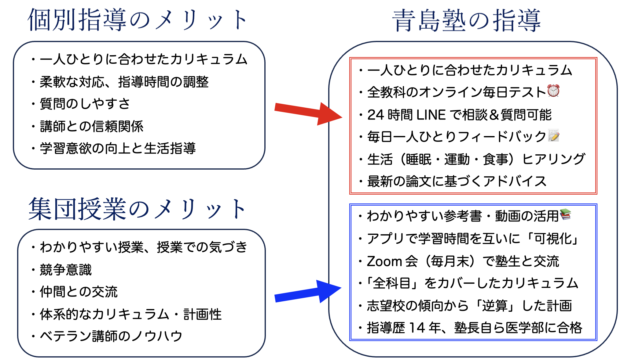 そこで青島塾では、授業を実施するのではなく、授業を受けるよりも効率的な「わかりやすい参考書」や「(無料の)動画講義」を指定し、「毎日テスト」を通じて学びを深めていただきます。その中で質問や相談に丁寧にお答えしながら、無駄なく最短距離で医学部合格まで導きます。