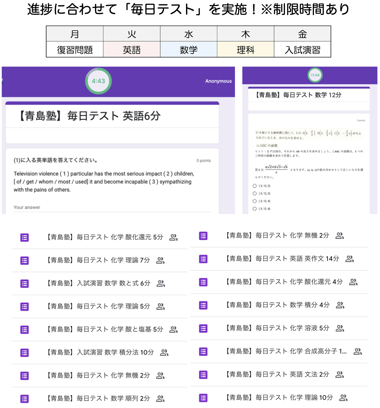 ※青島塾は授業ではなく「毎日テスト」と質疑応答を指導の中心としております。授業については「よくあるご質問」をご参照ください。