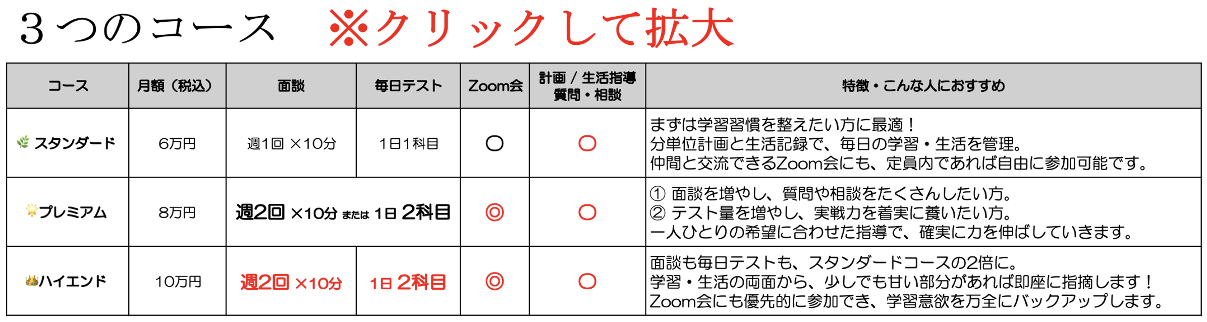 また、「面談を多く実施して欲しい!」という方や、「毎日テストを増やして実戦力を高めたい!」という方に最適なプレミアムコース:月8万円(税込)、面談も毎日テストも2倍実施し、「口頭試問」や「模擬面接」までカバーする最上位のハイエンドコース:月10万円(税込)もお選びいただけます。